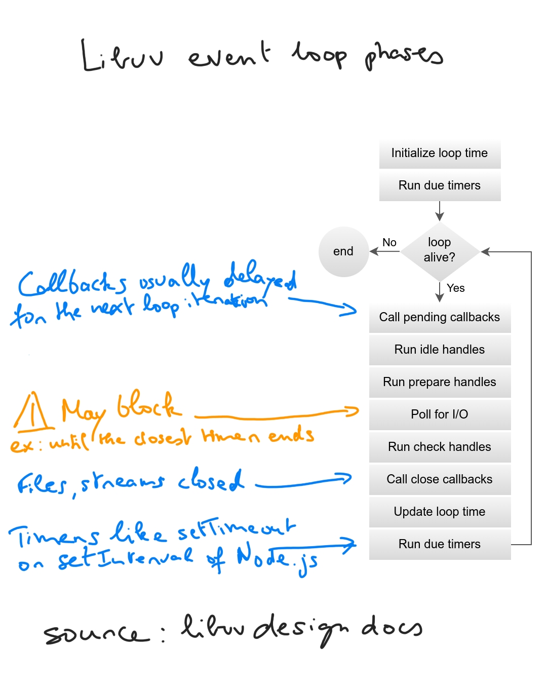 This cycle will repeat indefinitely, usually waiting in the poll I/O phase. Let’s talk about the different loop’s phases.